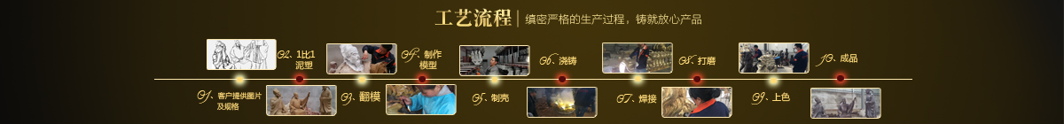 制作一件完美的鑄銅雕塑,最重要的步驟就是制作泥塑模型,然后再用工業硅膠拓印、翻模。所以泥塑的姿態(tài)、神情生動與否直接影響最終銅雕塑的品質。所以我廠一直對泥塑模型的制作格外重視。我廠以雕塑為本,以藝術為根,挾中華文化之傳統,偕歐陸藝術之風韻,風格獨特,盡顯淋漓盡致。我們本著大膽創新、勇于突破的精神,以追求卓越為導向,堅持寧缺勿濫為原則,并可依照您提供的要求,為您量身設計制作。我廠人才濟濟,有智慧嚴謹的管理班子,眾多年輕充滿激情、充滿創意的專業設計團隊、有專業技術精湛的雕塑制作人才和專業的施工隊伍。他們不僅具深厚的文化藝術底蘊,更汲取當代雕塑精華,博采眾家之長,作品既有嚴肅莊重寫實題材,也有輕松前衛的抽象題材,表現手法上浪漫主義中不乏樸實,現實主義中蘊涵著激情,設計理念貫穿古今、融匯中西,深刻詮釋著藝術的精髓,把古典主義和后現代主義完美的融合,將雕塑藝術演繹為力的凝聚、美的體現,讓人們感受到的不僅是一種藝術的浪漫與優(yōu)雅、粗獷與悲壯、更是豐富的優(yōu)秀藝術寶藏和文化傳統,讓您在藝術與文化中穿流,在時空中飄蕩,使靈魂在藝術的海洋洗禮。 MORE+